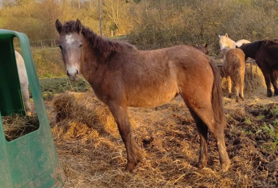 Hongre alezan de 4 ans, taille C. Gentil et familier. A débuté la compétition en CSO en cycle classique 4 ans cette année. Il a un joli modèle, de belles allures et un bon équilibre.