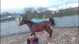 Juste rentrée du pré pour débuter le débourrage. Commence à tourner en longe avec la selle.